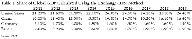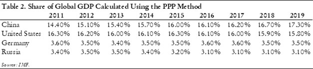 If we look at the United States, Germany, China, and Russia on the basis of exchange rate (table 1) and PPP (table 2) comparisons, several conclusions jump out. First, it is clear that the exchange rate method significantly underestimates the size of the Chinese and Russian economies. Using the exchange rate method, the size of the Russian economy is half that of Germany’s and around 130 percent of Spain’s. China, while growing more rapidly, is around two-thirds of the U.S. economy in 2019. With the PPP method, however, the profile of the Russian and Chinese economies changes drastically. The Russian economy almost becomes the equal of the German economy, while the Chinese economy reaches parity with the U.S. economy in 2016 and has since taken a slight lead.