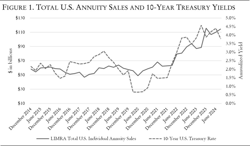 4 “Limra: Record-High 2023 Annuity Sales Driven by Extraordinary Growth in Independent Distribution,” limra, March 12, 2024; limra, Preliminary U.S. Annuity Third Quarter 2024 Sales Estimates (Windsor, Conn.: limra, 2024).