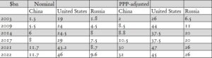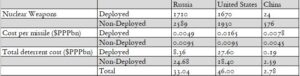 It seems more fruitful then to build estimates of the various strategies from the ground up. Even if these do not turn out to be accurate, they will give a better sense of how much money a country might save by shifting from a Russian or American nuclear deterrent strategy to a Chinese nuclear deterrent strategy. We know that in 2022 the American nuclear budget was $46 billion. We also know that the CBO has reported that around 60 percent of the budget is allocated to strategic forces (ICBMs, SLBMs, bombers), command, control, communications, and early warning systems, that is, to deployed forces.29 If we divide the budget up using these figures, we find that each deployed nuclear warhead in the United States costs around $16.5 million a year annually, while each non-deployed nuclear weapon costs around $9.5 million annually. We can then apply these ratios to the Chinese and Russian data which we can then PPP-adjust to try to get a reasonable comparison. These are laid out in the table below: