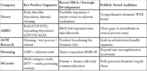 60 Naura has been expanding its semiconductor equipment portfolio since 2015, aiming to establish a comprehensive domestic supply chain in China. While it has made significant progress in front-end and back-end semiconductor processes, the lack of advanced lithography machines remains a critical gap. Its recent investment in Kingsemi, a company specializing in lithography-related coatings and equipment, is a critical indication of both consolidation and directionality. Naura’s investment strategy suggests a long-term plan to strengthen domestic semiconductor manufacturing.